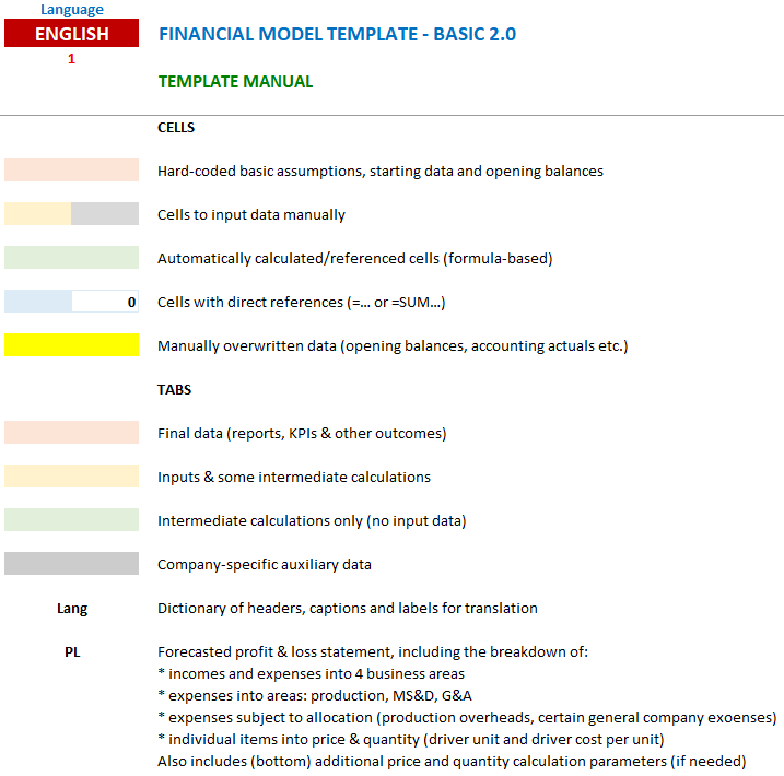 - The template provides only basic funcionality: reporting lines, financial analysis ratios, driver (price/volume) analysis and forecasting and automated balancing of the reports.