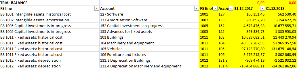 The sheet FS is a list of financial reporting lines, and the sheets BS and IS incorporate the automatically generated financial reporting forms provided that the trial balance ( sheet TB ) is mapped to the reporting lines. This allows to verify that the reporting forms submitted to tax authorities previously correspond to the calculations source data (otherwise, the correctional financial statements might need to be resubmitted to tax authorities).