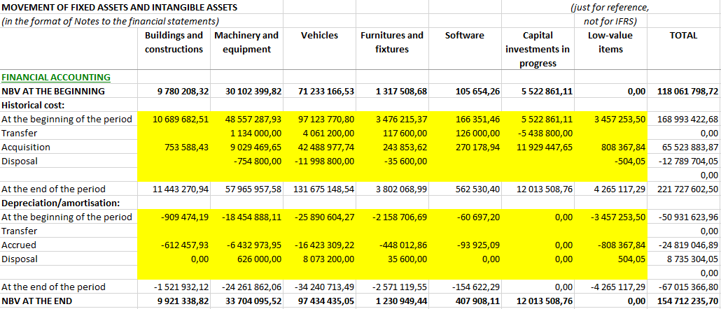 The sheet FXA incorporates a report on the fixed assets movement of financial accounting. The report contains the summary data from a separate file with all supporting data prepared by the asset accountant. To reduce the time to prepare various fixed assets reports, it is recommended to compile this report in a format required for the fixed asset movement note to the financial statements (by respective asset classes), as it is in the Workbook:
