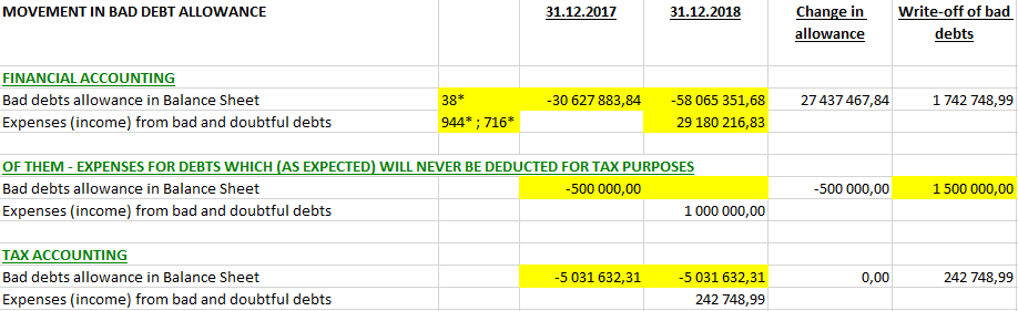 - for doubtful debts allowance – the value of debts recognized as deductible expenses in tax accounting in the periods preceding a balance sheet date, as well as the amount of debts that will never be deducted (as the temporary differences do not arise)