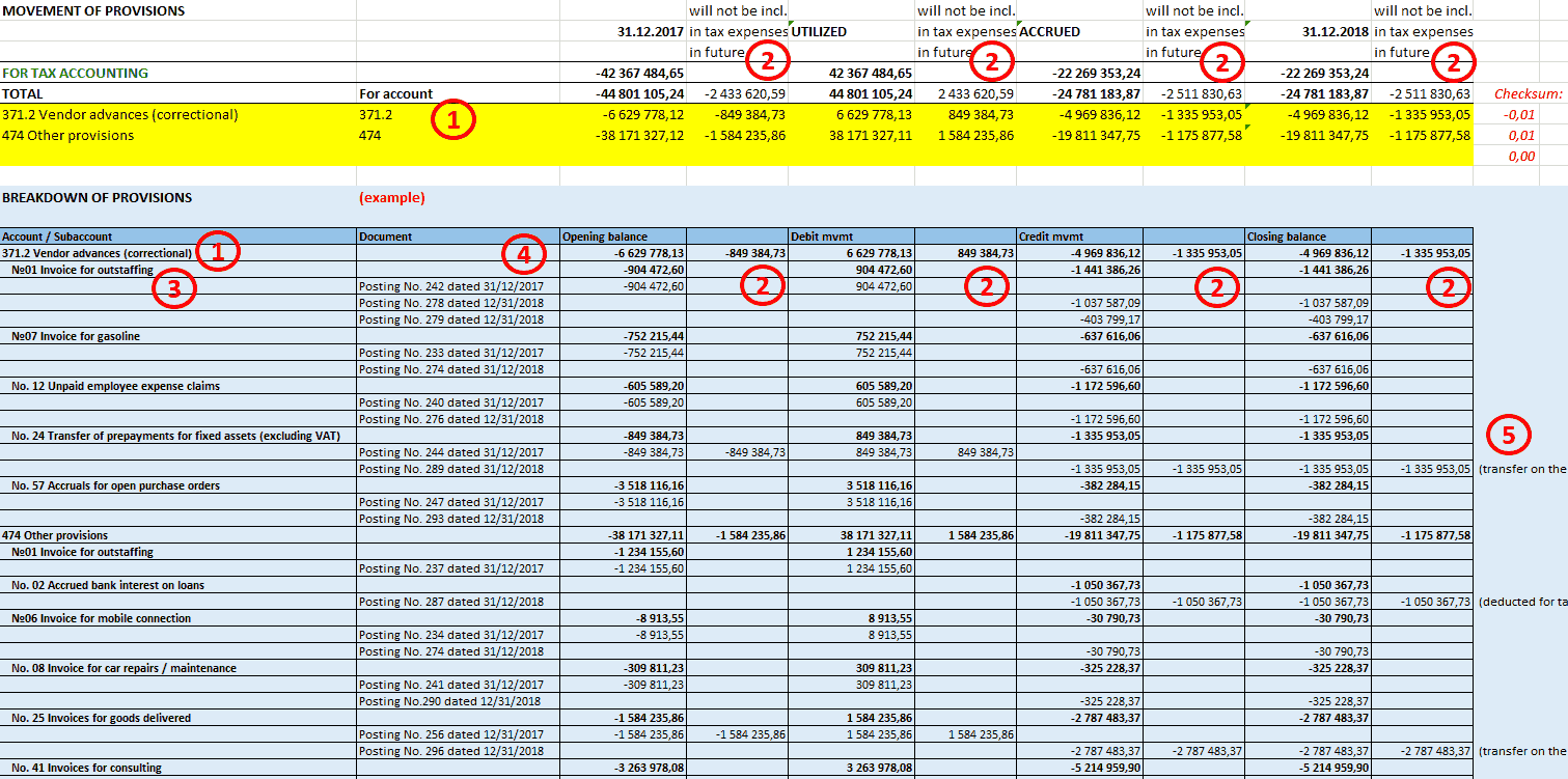 - The tax-relevant provision accounts should allow detailed account analytics for further analysis during the tax return preparation and checking
