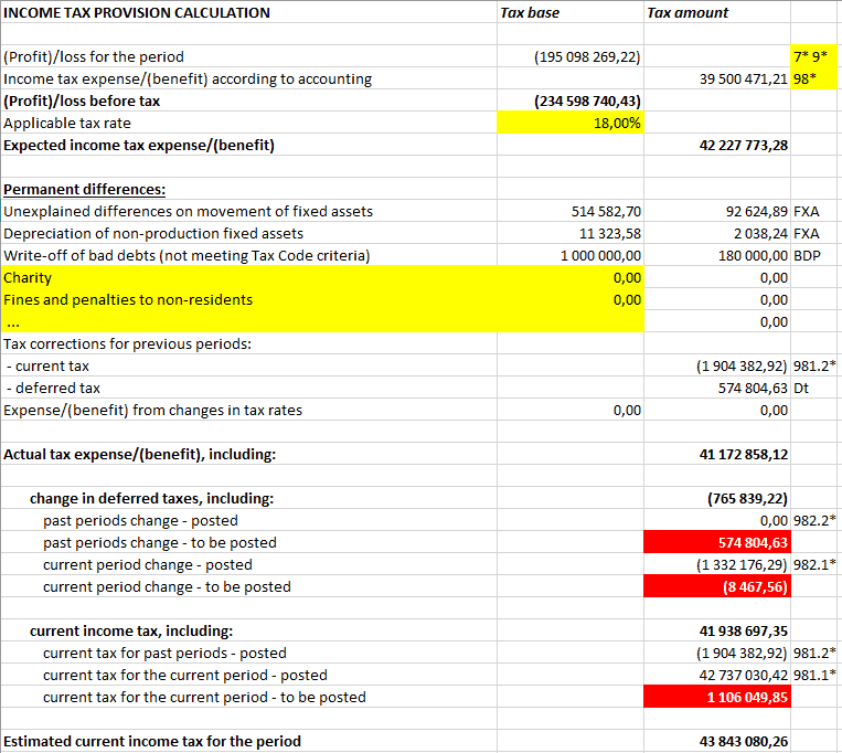 ATTENTION! The considered methodology contains one significant limitation: if a company creates non-tax-deductible provisions debited to the inventory (work-in-progress or finished goods) accounts with some balance at period-end, the respective balances inside such lines will not be taken into account (taxable profit will be artificially overstated by the amount of such provision for the first period, and later artificially understated for the same amount in the subsequent tax period). The reason being this is a quite time- and resource- consuming exercise, as well as such calculation would be rather unique for each company.